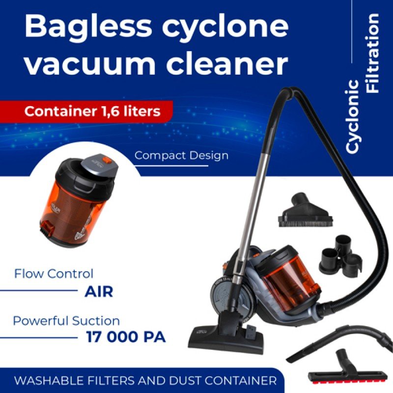 The Adler AD 7065 Bagless Cyclonic Vacuum Cleaner is designed for efficient everyday cleaning of hard floors, carpets, sofas, cars, and hard-to-reach corners. Its compact shape takes up minimal space, making it a convenient and powerful addition to any home.