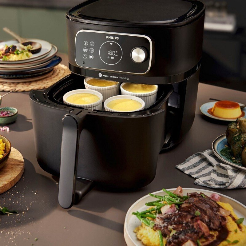 Senzaţia gustului: imaginează-ţi feluri de mâncare gătite întotdeauna exact aşa cum îţi place şi o serie de reţete noi de încercat, gustat şi savurat. Cu tehnologia Rapid CombiAir, aceasta este o realitate! Airfryer Combi cu HomeID reglează automat timpul de preparare, temperatura şi viteza aerului. Alege un flux de aer scăzut pentru prepararea fripturii sub vid, a tocăniţelor cu gătire lentă şi pentru fierberea înăbuşită a cărnurilor. Posibilităţile de gătire cu flux de aer ridicat, scăzut şi dinamic garantează că alimentele sunt întotdeauna delicios de fragede în interior şi perfect de crocante la exterior.