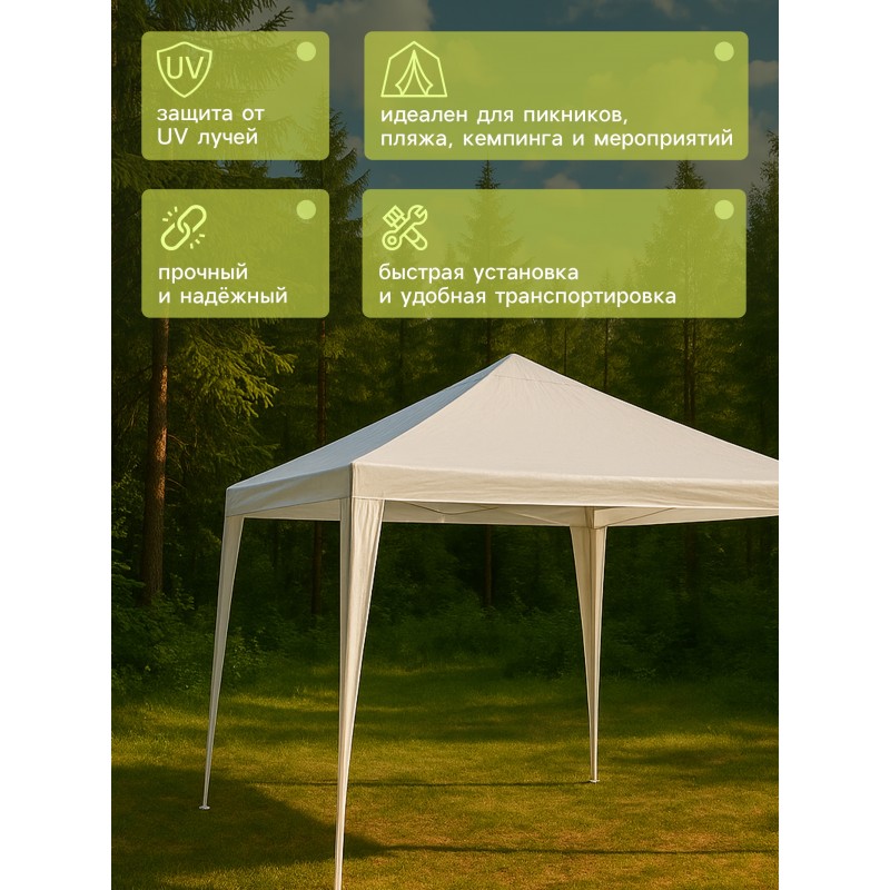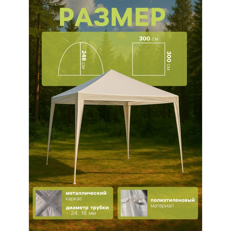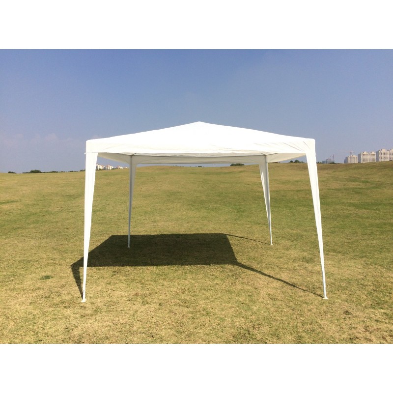 Acest cort spațios de 300x300 cm și o înălțime de 248 cm este soluția perfectă pentru recreerea în aer liber. O structură metalică cu țevi cu diametrul de 18,24 mm asigură stabilitate, în timp ce o prelată groasă din polietilenă (90 g/m²) protejează de soare și de ploaie ușoară. Culoarea albă reflectă căldura, creând o umbră confortabilă.
