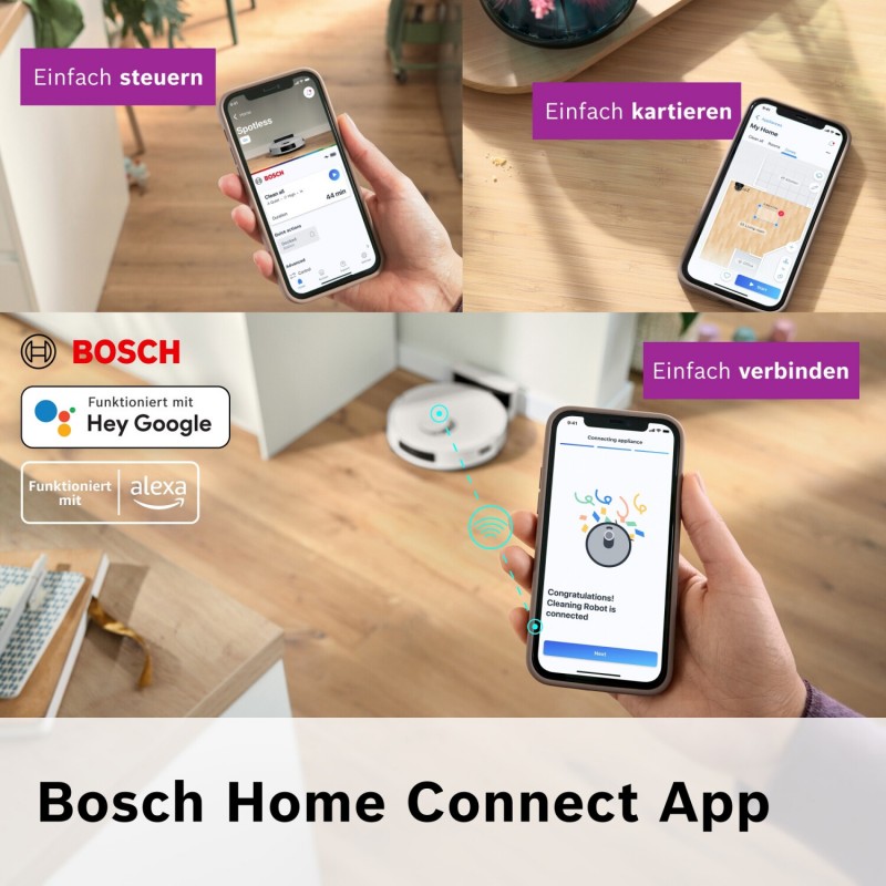Cu aspiratorul Spotless, poti sa ajustezi curatenia pentru fiecare camera si tip de podea. Foloseste aplicatia Bosch Home Connect pentru a alege daca vrei stergere umeda sau nu, pentru a regla cantitatea de apa si intensitatea curateniei.