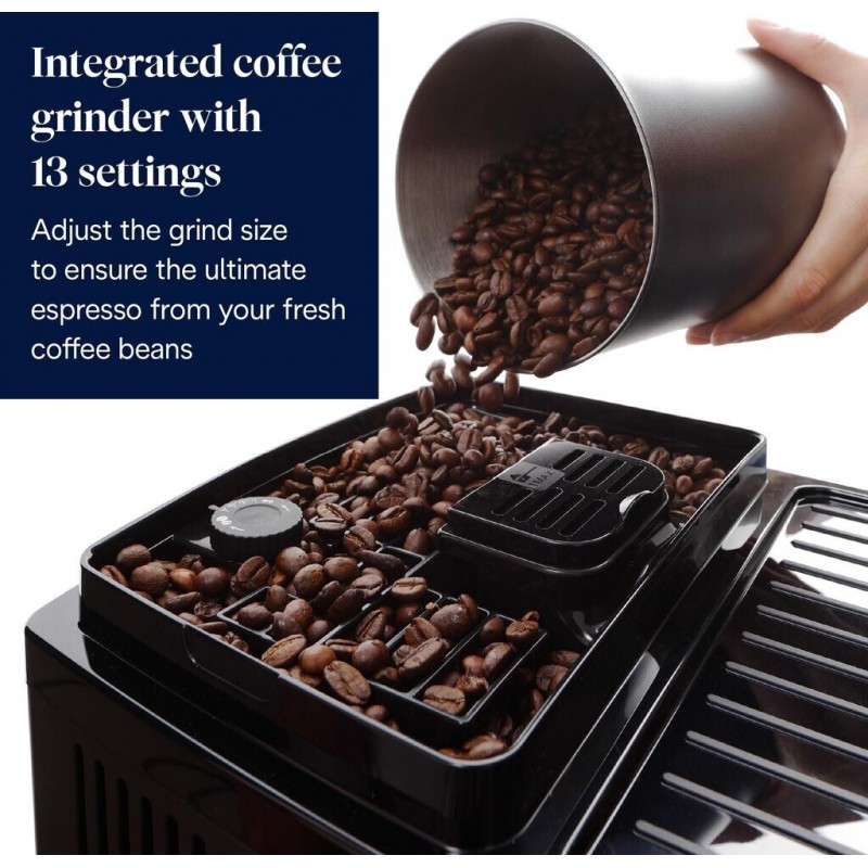 In functie de sortimentul de boabe de cafea ales, nivelul de rasnire poate fi ajustat dupa preferinta, gratie celor 13 setari. Capacitatea recipientului pentru boabe este de 250g, iar cea a rezervorului de apa de 1.8l. Espressorul ofera si posibilitatea de a folosi cafea premacinata.