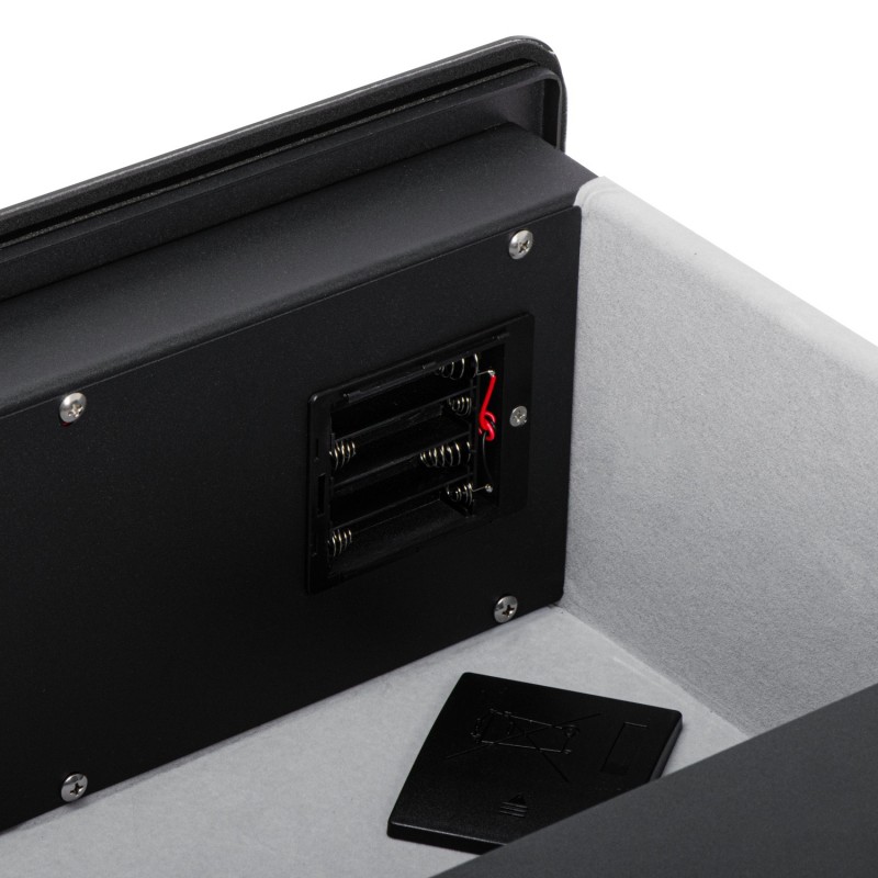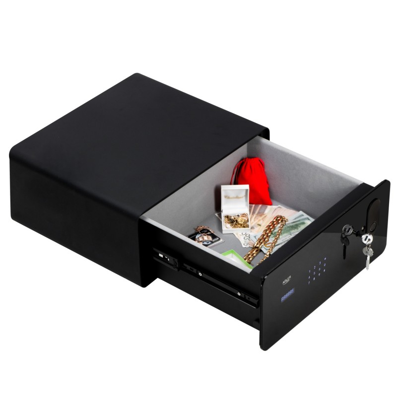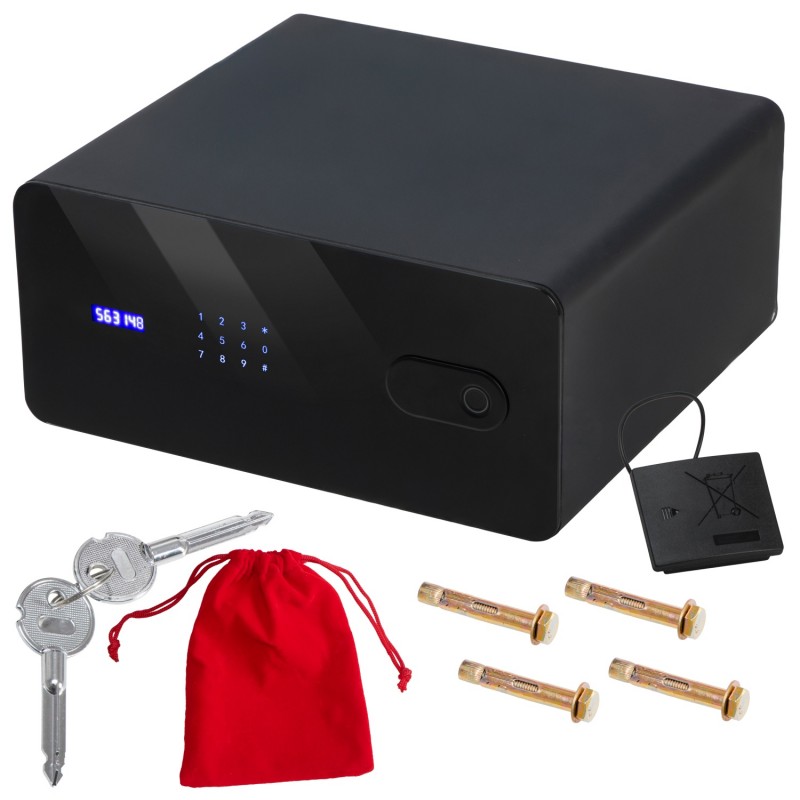 Durable steel construction - body made of hot-rolled Baosteel Q235B steel (2 mm thick), door panel made of tempered glass (4 mm thick).Class I burglary resistance certified according to EN 1143-1:2019 - proven protection against break-in attempts.Three access methods: digital code, fingerprint recognition (up to 100 users stored), or emergency key.Touch control panel with tempered glass screen - intuitive operation and sleek, modern design.Customizable password length (2-10 digits) - tailored security.Built-in alarm and low battery alert - for extra safety and reliability.Emergency opening options: external power source (included) or emergency key.Soft-lined interior - prevents scratches on stored items.Easy installation - pre-drilled holes with mounting kit included.