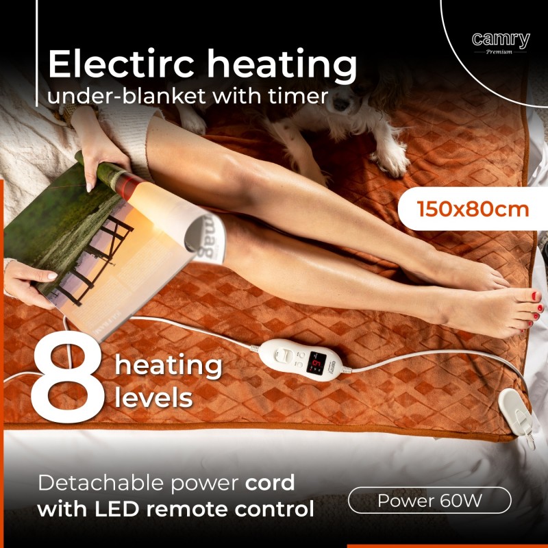 Электроодеяло Camry дарит расслабляющее тепло и комфорт. Рекомендуется людям, заботящимся о своём здоровье. Электроодеяло снимает невралгию, способствует расслаблению мышц и улучшает кровообращение. Рекомендуется при лечении артрита и ревматизма. Оно обеспечивает быстрое и равномерное распределение тепла. Это позволяет вам наслаждаться отдыхом в тёплой постели уже через несколько минут после включения электроодеяла. Одеяло изготовлено из мягкой и нежной ткани. Его можно легко постирать, отсоединив терморегулятор и шнур питания. Терморегулятор позволяет выбирать уровень температуры и обеспечивает защиту от перегрева.