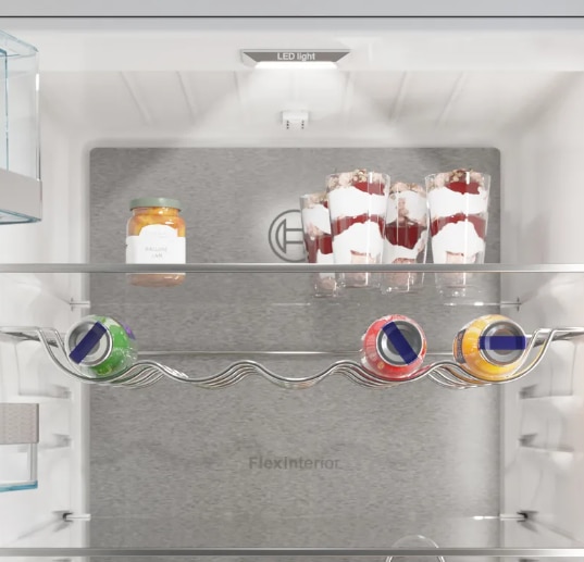 Iubesti condimentele, dar nu si modul in care acestea aglomereaza un frigider? Frigiderele noastre incorporabile ofera o varietate de optiuni flexibile de depozitare pe usa. Un recipient foarte adanc in partea de jos gazduieste doua randuri de sticle mai inalte, ceea ce il face perfect pentru dressing-uri de salata si sucuri, in timp ce tavile se ocupa de articolele mai mici. Totul ca tu sa te poti bucura de cat mai mult spatiu in interiorul frigiderului.