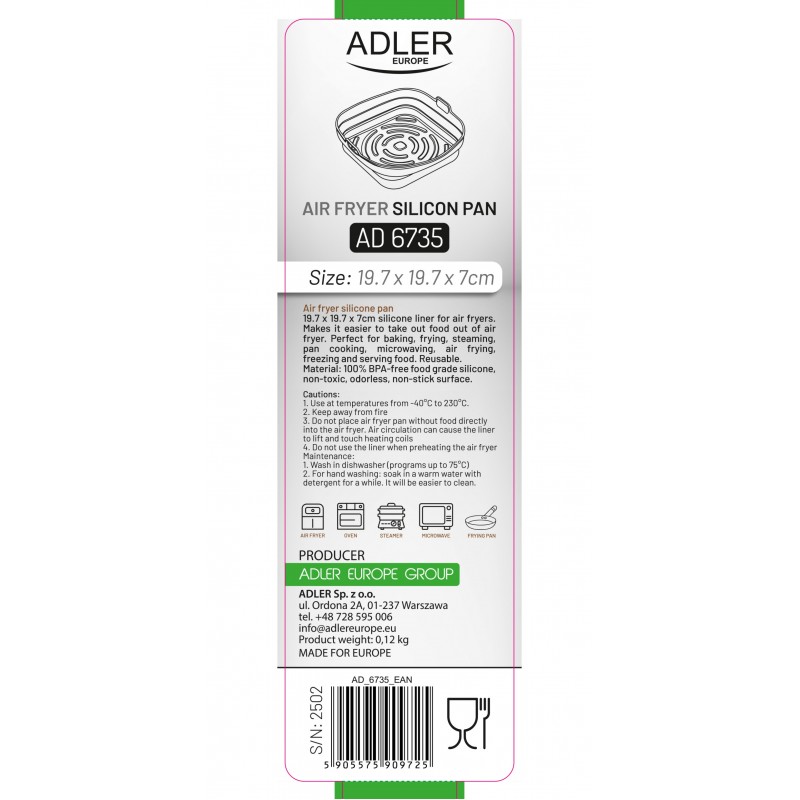 Adler AD 6734 — практичный круглый силиконовый поднос, разработанный для аэрофритюрниц, который облегчает приготовление и извлечение продуктов. Изготовлен из высококачественного пищевого силикона без бисфенола А, безопасен для прямого контакта с продуктами питания и подходит для многоразового использования, представляя собой экологичную альтернативу одноразовым подносам.